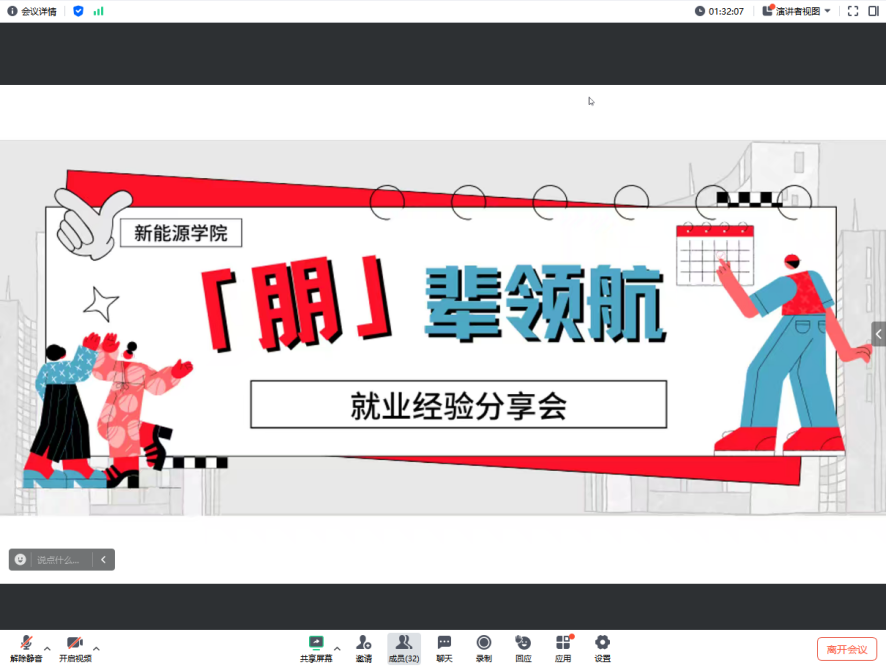 为持续推进学生更充分更高质量就业,发挥朋辈示范引领作用,引导学生了解就业市场需求和提升就业竞争力,更好地规划自己的职业发展道路,av网站 于12月24日下午在主B606举办“朋辈领航·能源筑梦”就业经验分享会。本次分享会由研究生辅导员陈思主持,活动邀请到6位优秀毕业生代表作主题分享,线上线下60余名研究生参会。