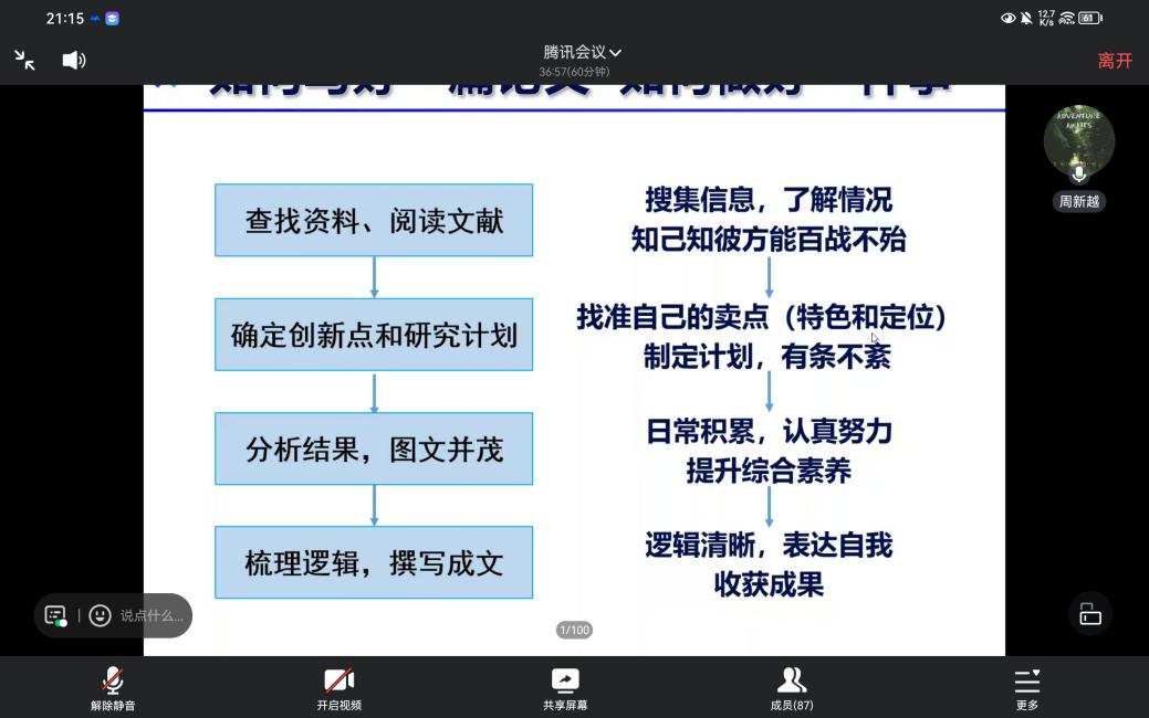 周新越,现就读于av网站 博新能源2165班,获得国家奖学金、优秀博士奖学金。她从“科技论文、竞赛和会议、社会交流会”三个方面引导同学们如何平衡科研与生活。她表示,卓越的科研成就来自条理清晰的研究思路:以文献阅读掌握研究现状,以精确找准创新点打开局面,加之以逻辑通顺的成文结构和图文并茂的数据分析,才能生成一篇高水平有价值的好文章。另外,她鼓励大家让社会交流会成为学术生活的添加剂,培养自己待人接物的能力,并学会调节心态,坦然面对挫折。