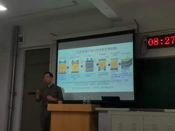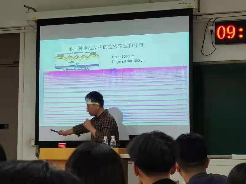 2021年5月28日,中国科学院微电子研究所贾锐研究员应李美成院长邀请,来我校为av网站 师生做新能源器件制备技术与应用的专题课程讲座。贾锐研究员以高效晶硅太阳电池研究为主题展开,从五个方面详细地介绍了晶硅太阳电池的物理基础、产业化技术和未来光伏的发展趋势。贾教授精彩的讲解,让av网站 师生对高效晶硅太阳电池的前沿技术和光伏发电行业的发展趋势有了更加深刻的理解。师生也针对一些问题与贾教授展开了互动与讨论,本次专题课程在热情的探讨与交流中圆满结束。