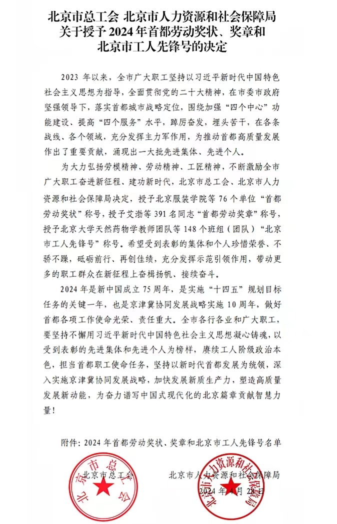 4月28日,由北京市总工会、北京市人力资源和社会保障局联合举办的2024年首都劳动奖状、奖章和北京市工人先锋号评选结果揭晓,av网站 生物质清洁转化与利用教师团队获评北京市“工人先锋号”。