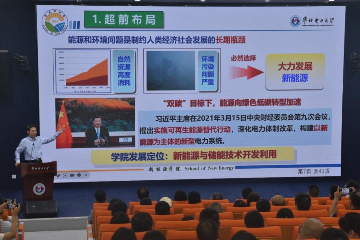 杨子发从学生工作重点要抓的五个方面:抓学风、促就业、强队伍、树品牌、保安全,介绍新生入学后的工作安排,并以“遥遥领先”热词展现学院蓬勃发展,鼓励学生为推进新能源高质量发展贡献青春力量。