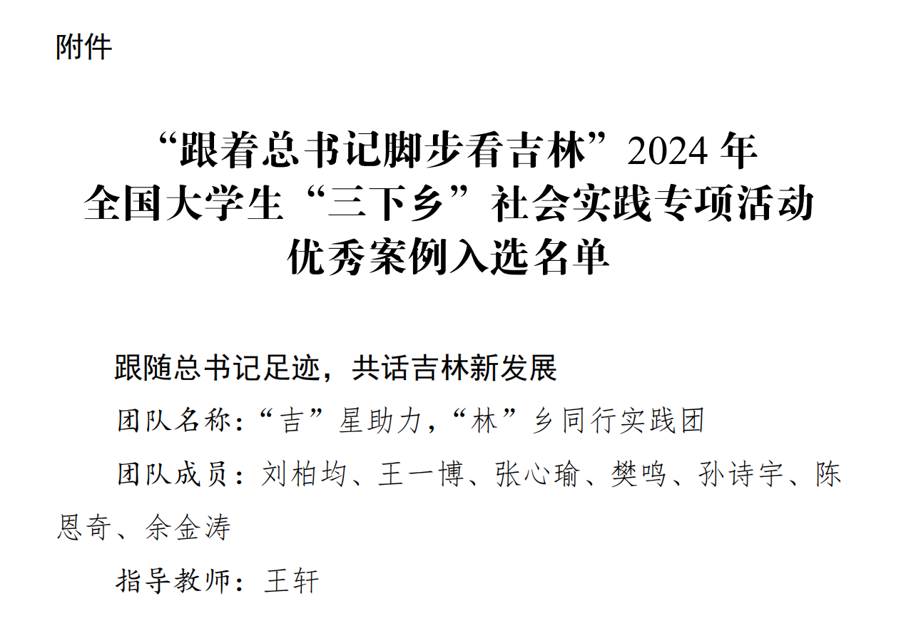近日,共青团吉林省委、吉林省学联发布《关于入选“跟着总书记脚步看吉林”2024年全国大学生“三下乡”社会实践专项活动优秀案例的通知》。av网站 “吉”星助力 “林”乡同行实践团入选“跟着总书记脚步看吉林”2024年全国大学生“三下乡”社会实践专项活动优秀案例。