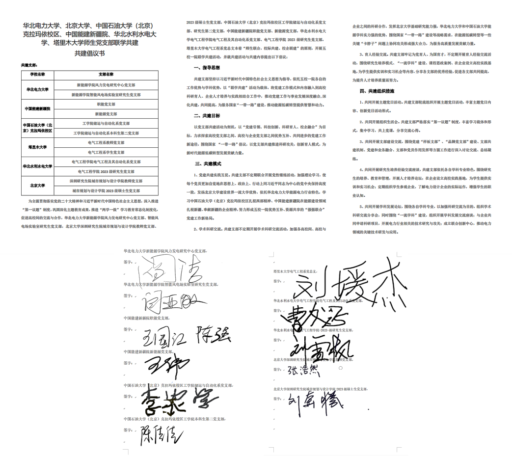 在庄重的云端倡议书签署仪式上,五校一院的党支部代表通过线上平台,共同完成了《联学共建倡议书》的签署。各方一致承诺:未来将持续强化党建引领核心作用,深化校企协同,促进资源共享与优势互补,以党建“红心”点亮业务“匠心”,共同推动能源电力事业的高质量协同发展。随后,全体与会成员线上线下共同起立,在av网站 智能风电场实验室研究生党支部宣传委员欧阳雅莉的领唱下,齐声高唱《歌唱祖国》,展现了昂扬的精神风貌。