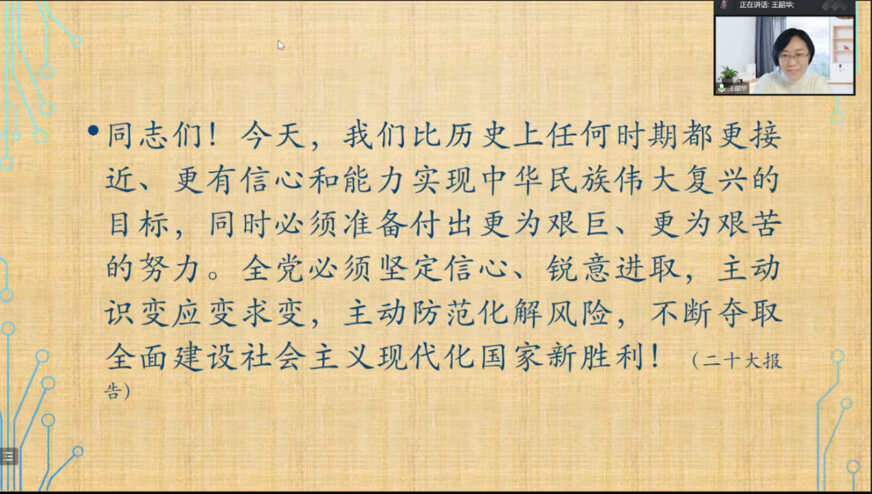 最后,杨英杰教授用习近平总书记在党的二十大报告中的一段话作为结尾。“今天,我们比历史上任何时期都更接近、更有信心和能力实现中华民族伟大复兴的目标,同时必须准备付出更为艰巨、更为艰苦的努力。全党必须坚定信心、锐意进取,主动识变应变求变,主动防范化解风险,不断夺取全面建设社会主义现代化国家新胜利!”