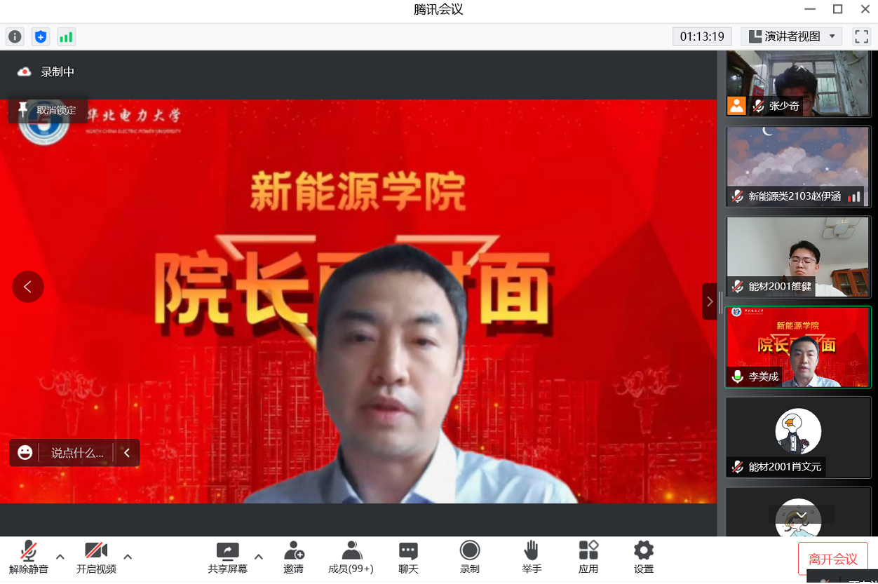 接下来,各个专业方向高年级学生代表就学习规划、学习方法、学科竞赛、就业保研等情况向低年级学生做经验分享,帮助大一学生在专业分流和学习适应方面加深了认识。李美成院长也提醒同学们在专业学习中不要局限于自己的小方向,要学习新能源专业的整体框架,在概念清楚、思路清晰的条件下,探索自己感兴趣的发展方向。
