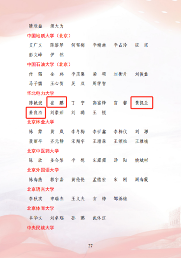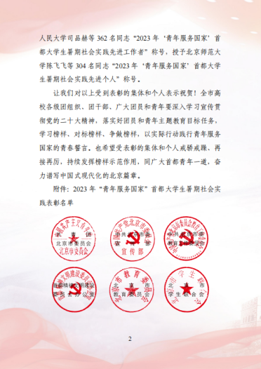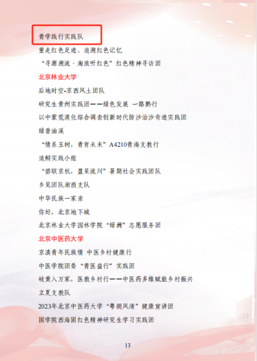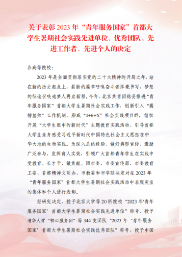 在2023年“青年服务国家”首都大学生暑期社会实践表彰中av网站 “耕新拾光实践团”、“青学践行实践队”荣获“优秀团队”荣誉称号;姜良杰、黄凯兰、崔鹏荣获“先进工作者”荣誉称号。