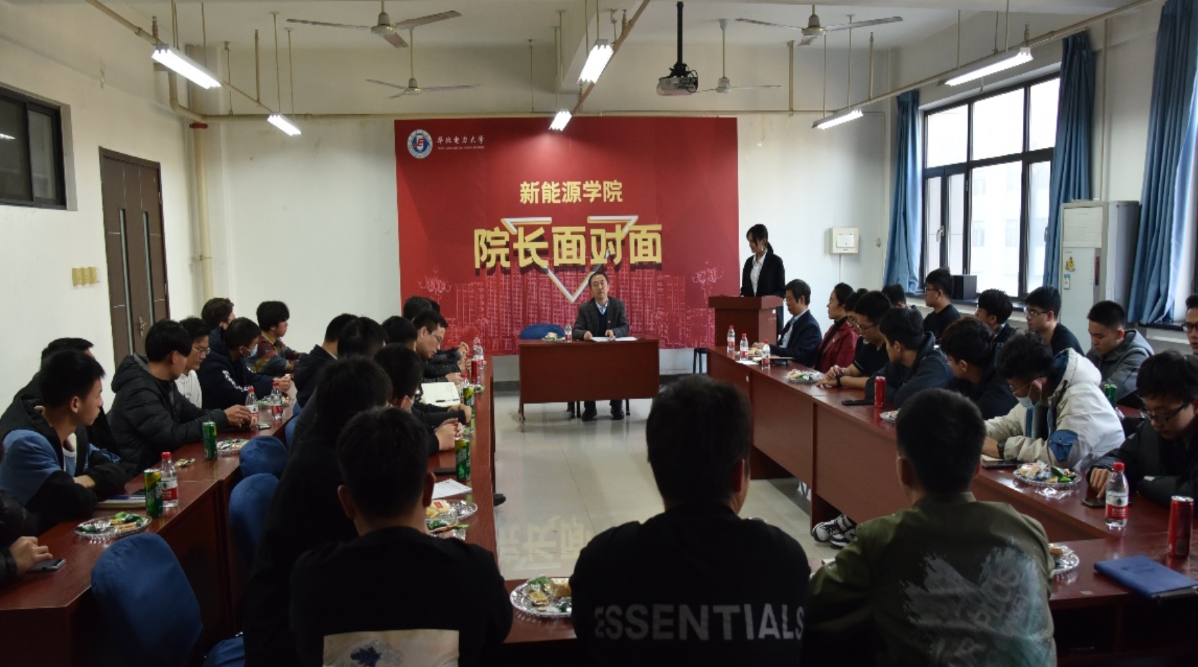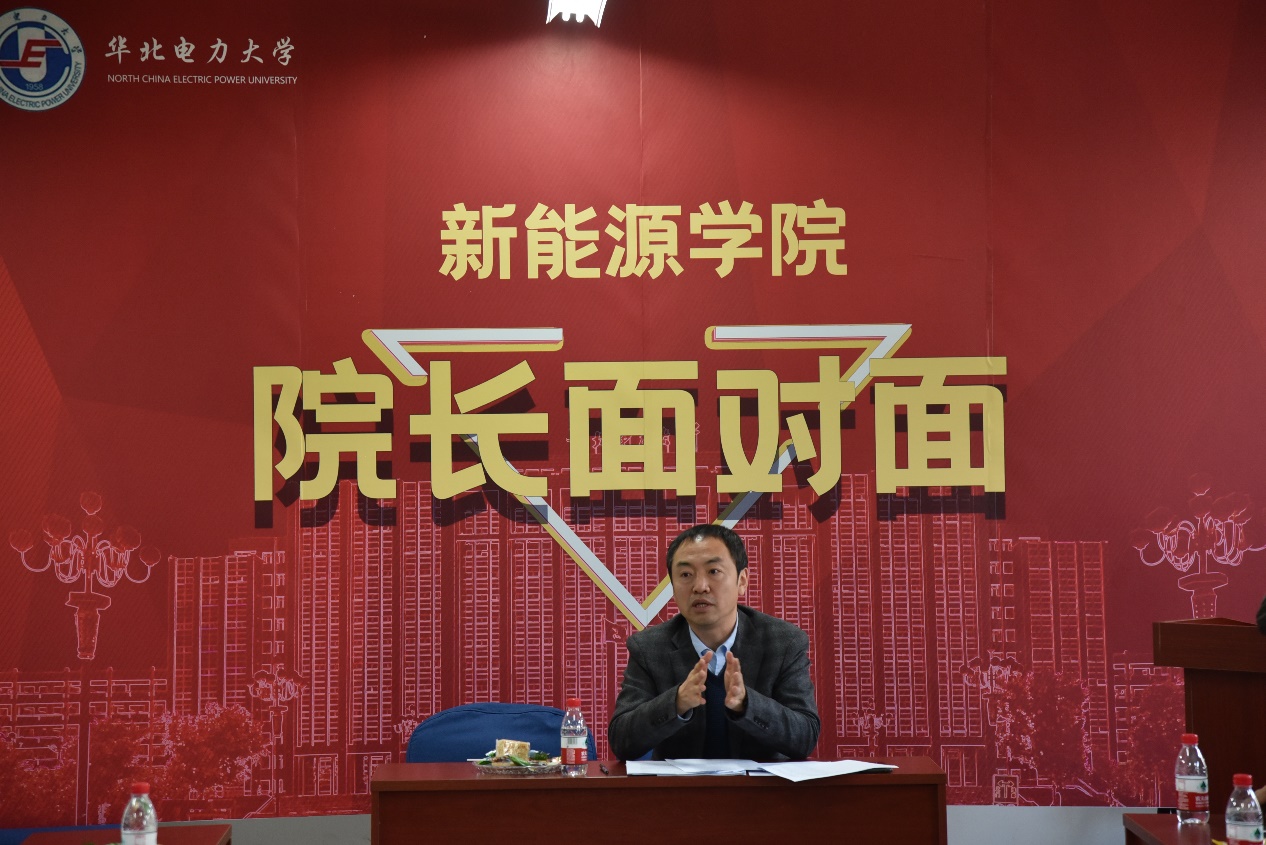 院长李美成进行主讲,参加的学生来自学院各个本科年级,党委副书记姜良杰、副院长葛铭纬、生物质中心主任董长青、太阳能教研室主任许佳、生物质教研室主任高攀、教授代表刘永前、马俊峰共同参与交流讨论。